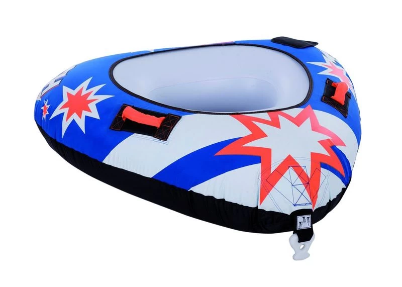 De Talamex Flash Funtube beschikt over een goede zitplek voor 1 persoon. De Talamex funtube heeft een driehoekige vorm met afmetingen van 136 x 141 cm. Op de Talamex Flash Funtube zitten 2 handvatten bevestigd zodat je je stevig kunt vasthouden en er dus niet gemakkelijk vanaf valt. De Talamex Flash Funtube is voorzien van een boston ventiel. Dit is een ventiel dat makkelijk met natte handen om te draaien is. Verder blijft de funtube altijd drijven doordat het beschikt over een waterlozer. Om ervoor te zorgen dat de Talamex funtube niet kapot gaat tijdens een wilde rit, is de Talamex Flash Funtube gemaakt van stevig nylon aan de buitenkant en PVC aan de binnenkant. De quick connector zorgt ervoor dat je het funtube touw gemakkelijk los en vast kunt klikken van de funtube. Met de Talamex Flash Funtube is een ding zeker, het is een garantie voor uren plezier op het water.